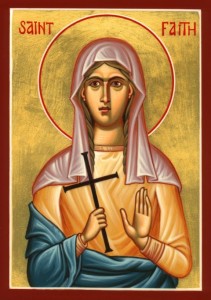 Faith was a young girl who had embraced the Christian faith despite her parents’ disapproval. When the Emperor Diocletian began the violent persecution of Christians, she was taken before Dacian, the procurator in Agen (France). Rather than defending their daughter against the authorities, her parents tried to persuade her to give up her beliefs and not threaten their standing in the community. But no amount of pleading could dissuade the girl in her steadfast defense of her belief in Christ. Despite her youth, Faith was tortured with a red-hot brazier which resulted in her death on October 6 in the year 287, the day of her heavenly birthday.