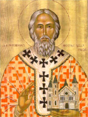 The arduous life of a missionary involves experiences and events which have been common to all who would take on the challenge of bringing the Christian message to a pagan people. From the first missionary journeys of the Apostles, and particularly St. Paul, to the work of missionaries serving today in African nations and countries now freed from the yoke of Communism, we hear similar stories of zeal and perseverance, trial and triumph. The life of St. Willibrord of Utrecht follows this familiar pattern. St. Bede the Venerable, who wrote his Ecclesiastical History of the English People while St. Willibrord was still living, tells us much of the story, and fifty years later, the monk Alcuin wrote a Life of St. Willibrord, filling in more details.